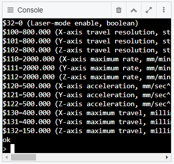 These parameters are sent by GRBL, which means that GRBL is running correctly. If you scroll up a bit in the console, you should even find the version number of GRBL that you just installed.